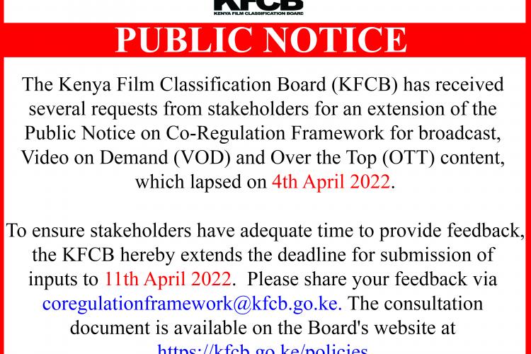 Public Notice on the extension of submission by stakeholders on the Co-Regulation Framework for broadcast, Video on Demand (VOD) and Over the Top (OTT) content.