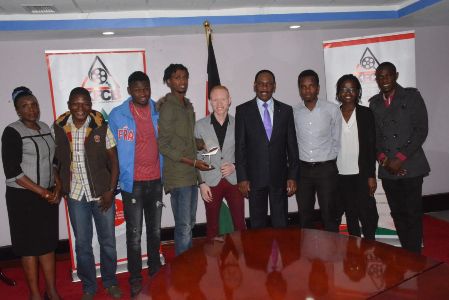 The Kenya Film Classification Board (KFCB) CEO Dr. Ezekiel Mutua with the K-Youth Media crew of the film MISFIT that participated in the Zanzibar International Film Festival (ZIFF2018) courtesy of KFCB sponsorship.