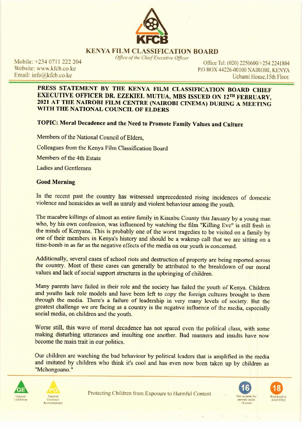 Press Statement by The KFCB CEO Dr. Ezekiel Mutua, MBS, Issued on 12th February, 2021 at The Nairobi Cinema / 15 February 2021 / 0 Comments Submitted by dennis@kikosi.co.ke on 15 February 2021 READ THE FULL PRESS STATEMENT ON MORAL DECADENCE