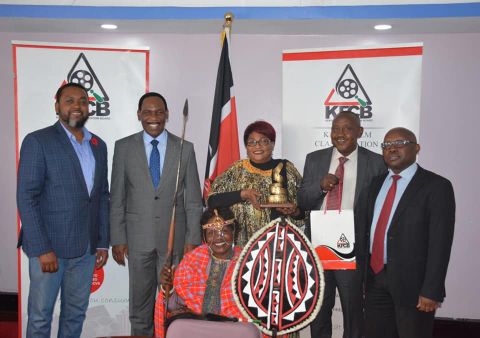 KFCB CEO Dr Ezekiel Mutua,MBS today led the Board in a meeting with Riverwood Ensemble Secretariat and Mediamax NL -the official Media sponsors for the just concluded Riverwood Academy Awards – to coronate Mary Khavere, popularly known as Mama Kayai as the 2018 Riverwood Film Warrior.