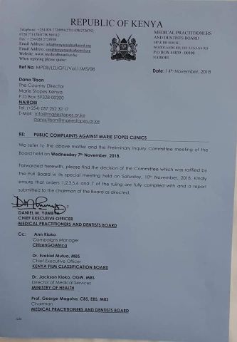 The order by the Kenya Medical Practitioners and Dentists Board (KMPDB) comes after a public outcry against the clinics’ advertisements that have been deemed to promote abortion.