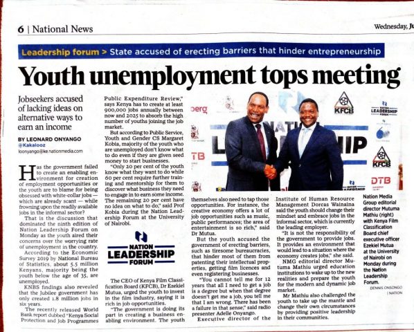 Youth Unemployment Tops Meeting / 31 July 2019 / 0 Comments Submitted by admin on 31 July 2019 https://www.nation.co.ke/news/Youth-unemployment-tops-NMG-forum/1056-5216982-k7w3bg/index.html